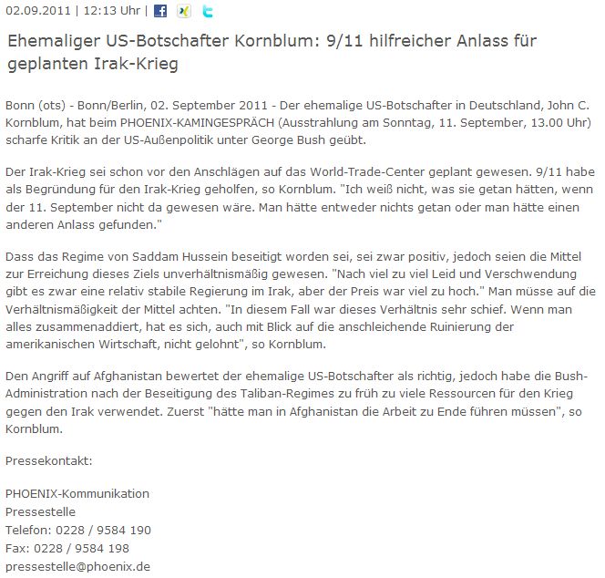 ehemaliger us-botschafter kornblum: 9/11 hilfreicher anlass für geplanten irak-krieg